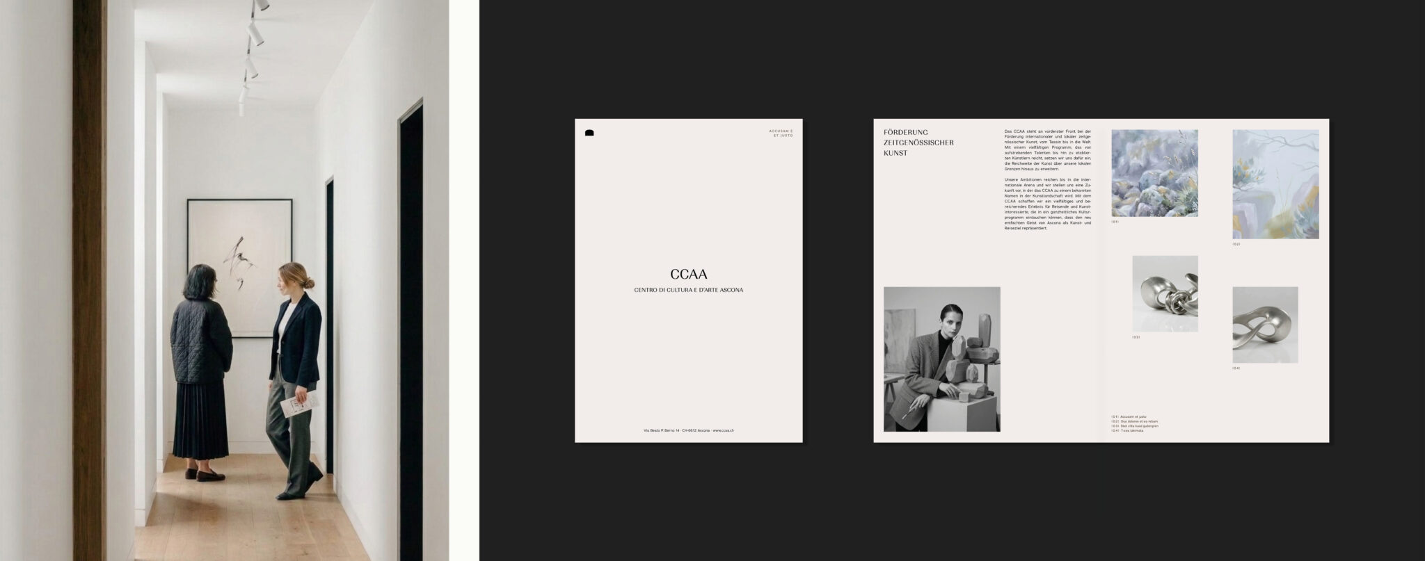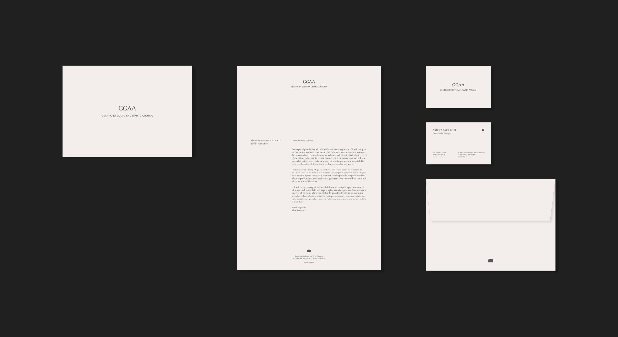 The CCAA is a centre for contemporary art and cultural exchange in Ascona, Switzerland. For its opening, I created a clear visual framework with a strong focus on the website and overall identity. The design offers a calm structure for exhibitions and provides space for both local and international artists.
